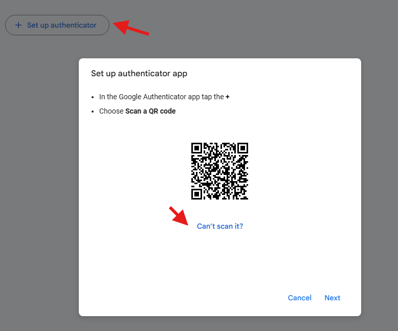 Can't scan it? 을 클릭하면 시크릿키가 보여집니다. 해당 시크릿키를 복사한다음 2FA 도구를 지원하는 사이트로 이동해주세요.
