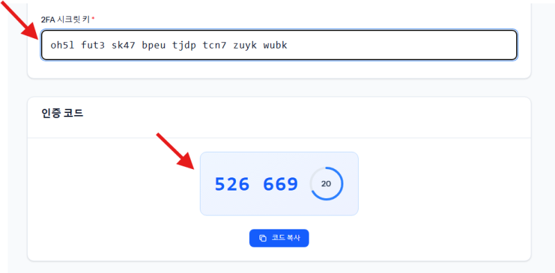 해당 화면에서 2FA 시크릿 키를 붙여넣고 엔터를 누르면 인증 코드가 발급됩니다. 인증 코드는 30초마다 변경되니 다시 구글 화면으로 돌아가서 인증 코드를 입력하면 2FA, 2차 로그인 인증이 등록된답니다.