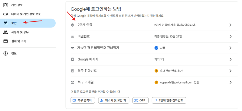 구글 로그인 후 보안 페이지로(https://myaccount.google.com/security) 이동합니다. 진행 시 굳이 언어 변경을 하지 않아도 하실 수 있는 분은 진행하시면 됩니다.