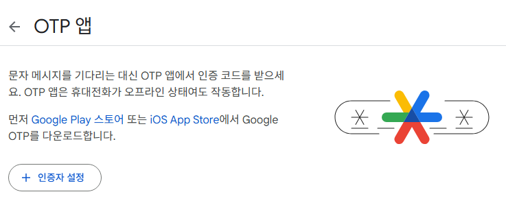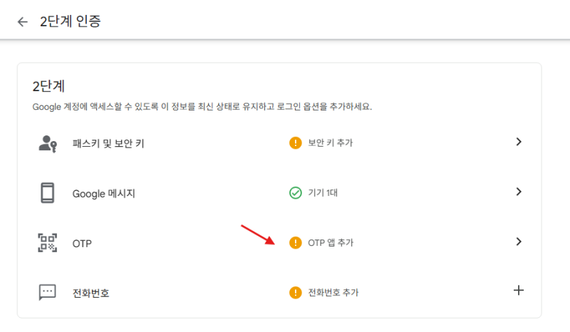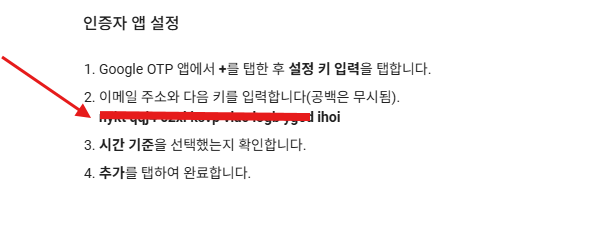 마지막 OTP 설정이 완료되었다는 문구가 뜨는 화면에서 OTP 외 Google 메시지에 모르는 기기가 표시되어 있는 경우 깡통 생성 이후 세션이 정상적으로 종료가 안되어서 남아있는 경우입니다. 이런 경우 보안 화면에서 모든 기기 관리 클릭 후 현재 세션을 제외한 다른 세션들을 클릭 한다음 로그아웃 해주시면 됩니다.