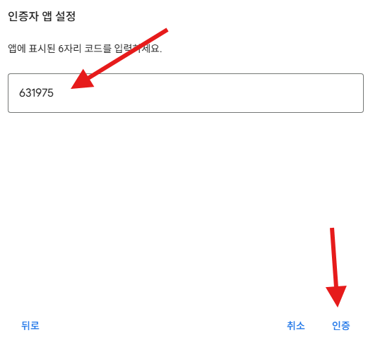 다시 인증자 앱 화면으로 돌아와서 다음 버튼을 클릭하고, 2FA 화면에 표시된 인증 코드를 입력한다음 인증 버튼을 클릭합니다.