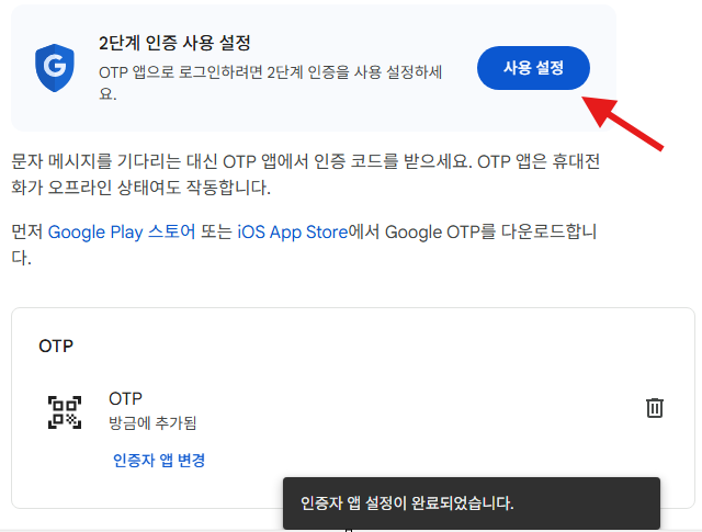 정상적으로 OTP 가 등록되었습니다. 이제 사용설정을 해야합니다.