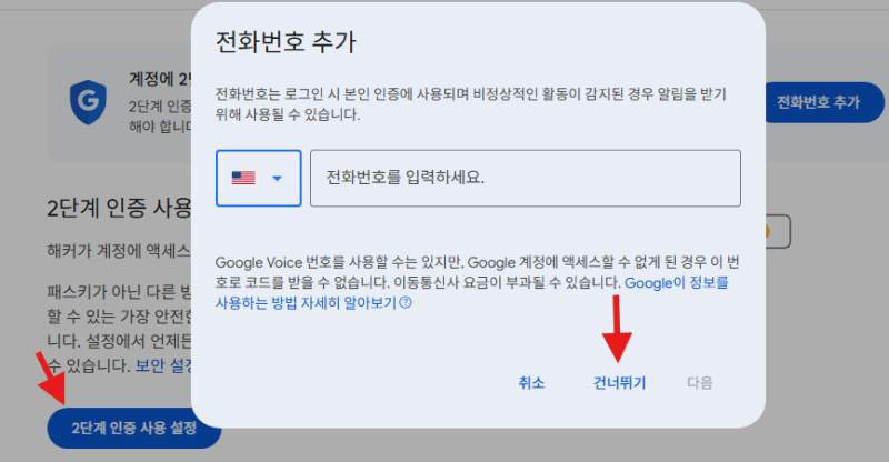 위 화면으로 다시 진입이 되면 2단계 인증 사용 설정을 클릭하고 건너뛰기를 클릭합니다. 이후 한번 더 전화번호를 묻는 화면이 표시되는데 무시하고 설정을 클릭 해서 단계를 마무리합니다.